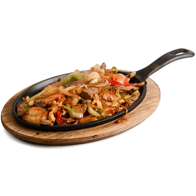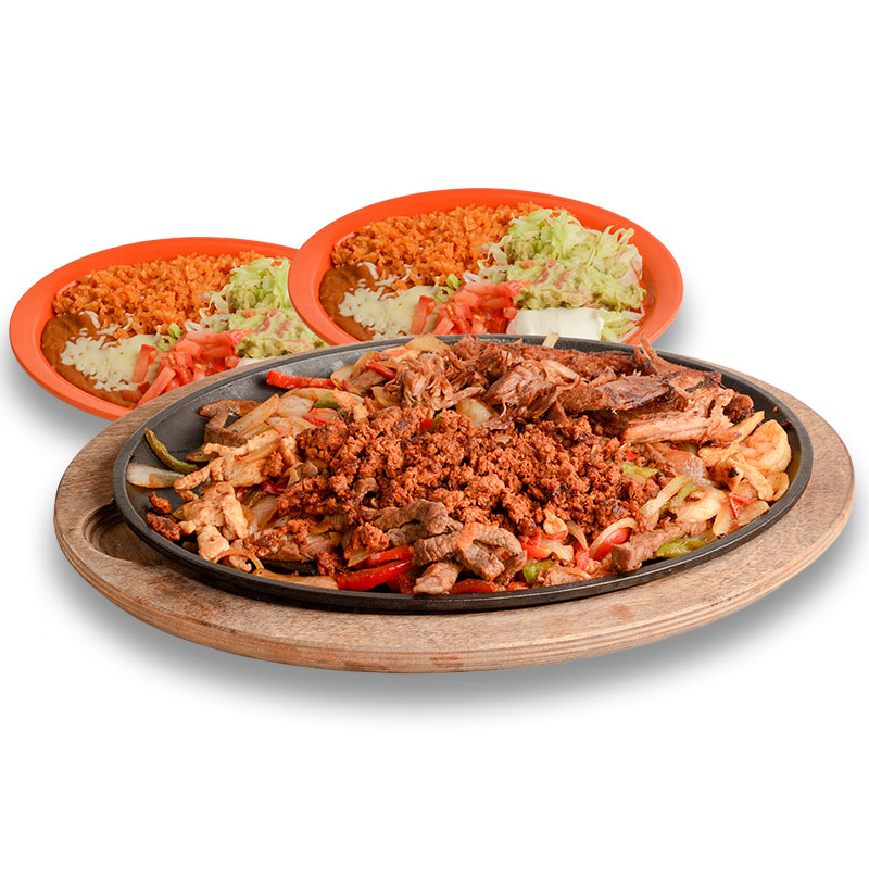 Carnitas, shrimp, Mexican sausage, chicken & beef, all deliciously sautéed with onions, bell peppers & tomatoes. Served with guacamole salad, sour cream, rice, beans & tortillas