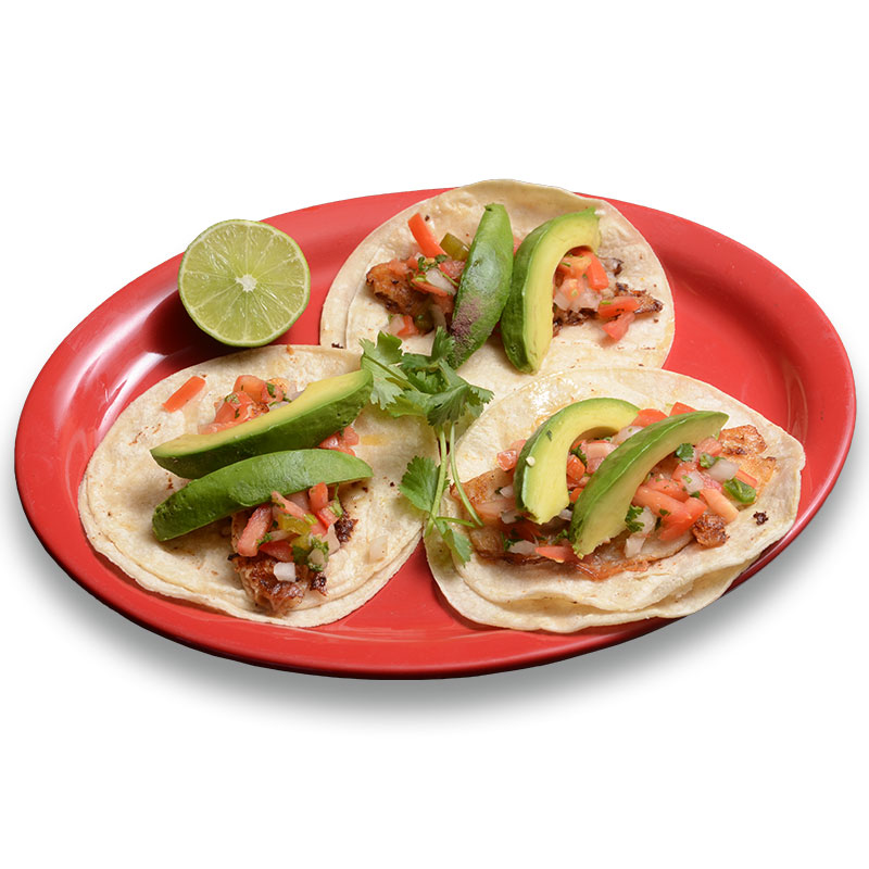 3 grilled fi sh tacos on corn tortillas with pico de gallo & fresh avocado, served with rice & beans